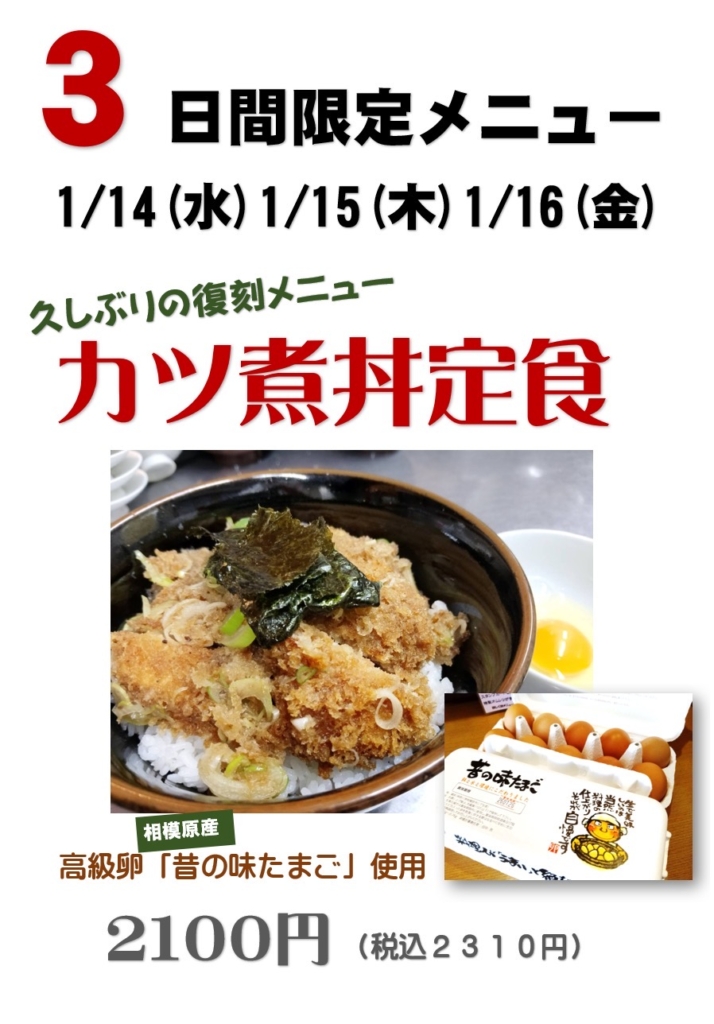 3日間限定メニュー 2026-01-13 今回は10年以上前に定番でお出ししていた『ひれカツ煮丼定食』です。 味付けはカツ丼風で生卵付き🥚 食べる直前に丼にかけてお召し上がり下さいね❗️ 卵は商売の勉強会で知り合った『昔の味たまご農場』さんのこだわり卵です。 今回の限定メニューのために相模原からお取寄せしました。 とっても美味しい卵なので、ぜひ味わってみて下さいね😊
