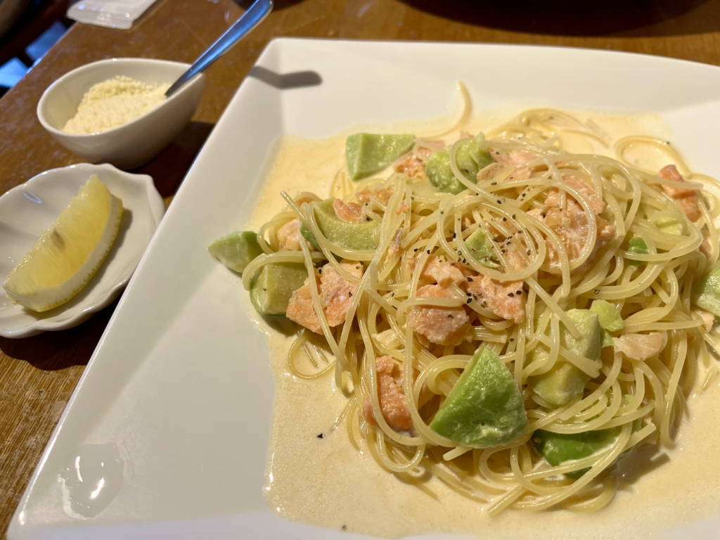 私はサーモンとアボガドのクリームソースパスタ。